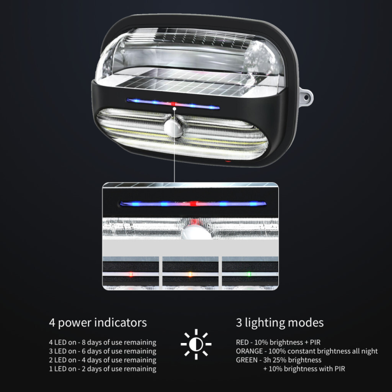 Päikeseenergia valgustil on 3 valgustusrežiimi ja selle töötemperatuur on vahemikus -20 kuni +60°C.
