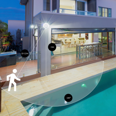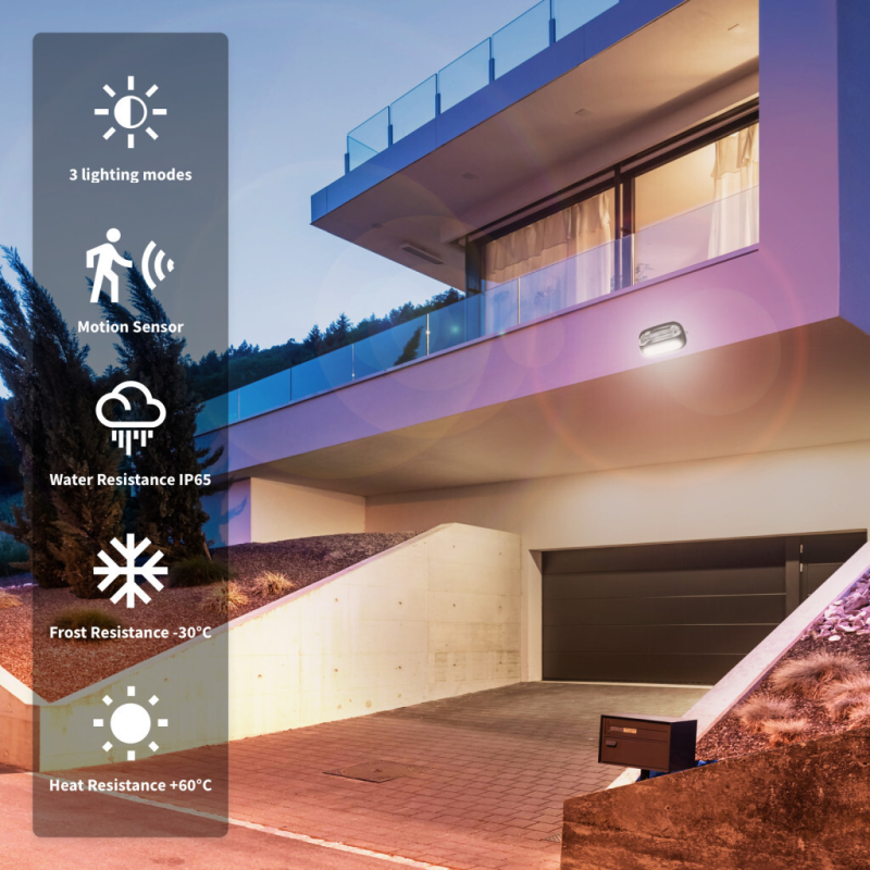 Välisvalgusti on automaatne - see süttib, kui ümbritseva valguse tase langeb 10 luksi tasemele ja kustub, kui valguse tase tõuseb 50 luksi tasemele. IP65 tolmu- ja veekindlus tagab valgustite pika kasutusea.
