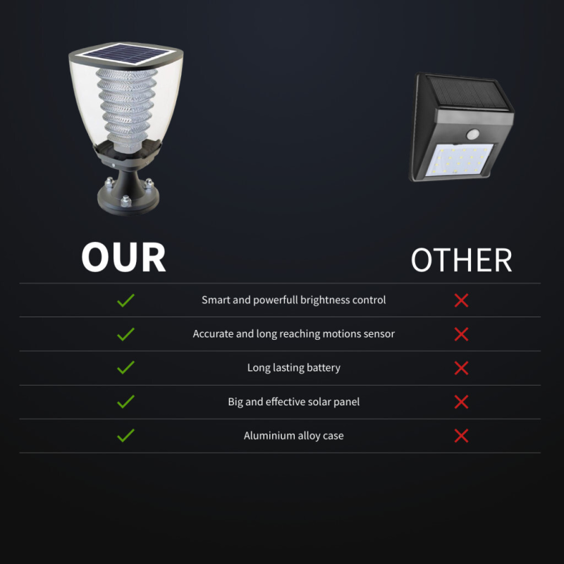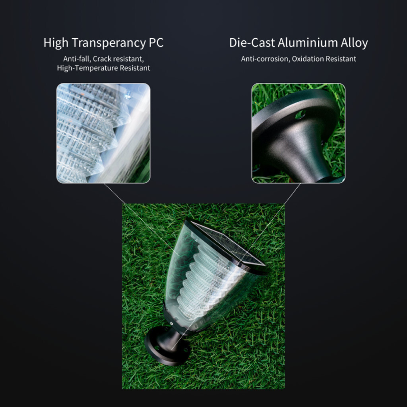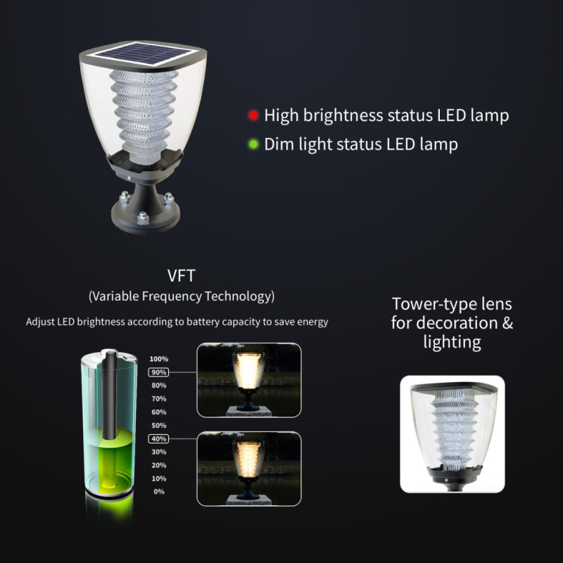 ALS2.0 + VFT + TCS intelligentne valgustustehnoloogia öiseks valgustamiseks (''Kogu öö valgustus''), isegi pilvise või vihmase ilmaga., Materjal: polükarbonaatplast., Päikesevalgus mõjutab otseselt aku laadimisaega.