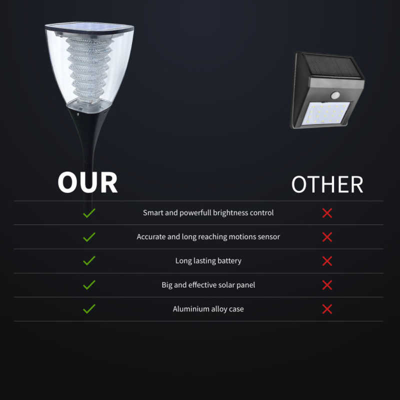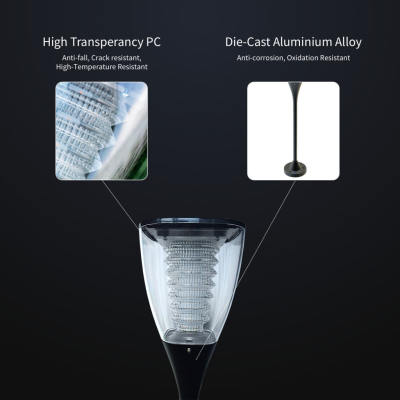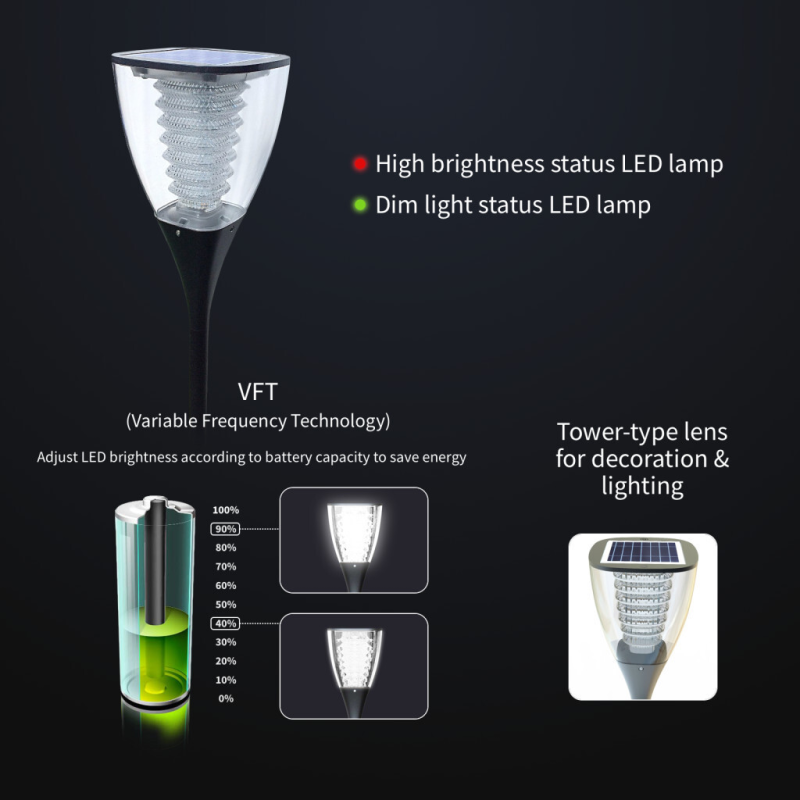 ALS2.0 + VFT + TCS intelligentne valgustustehnoloogia öiseks valgustuseks („Kogu öö valgustus“), isegi pilvise või vihmase ilma korral., Materjal: polükarbonaatplast., Päikesevalgus mõjutab otseselt aku laadimisaega.