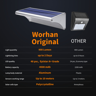 WORHAN® päikeseenergial töötavad valgustid lülituvad sisse, kui liikumist tuvastatakse 8 - 10 meetri kauguselt ning põlevad seni, kuni liikumine lõpeb ning 15 sekundit pärast seda. IP65 niiskuse ja tolmu eest kaitsev klass tagab valgustite pika kasutusaja.