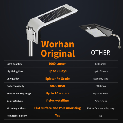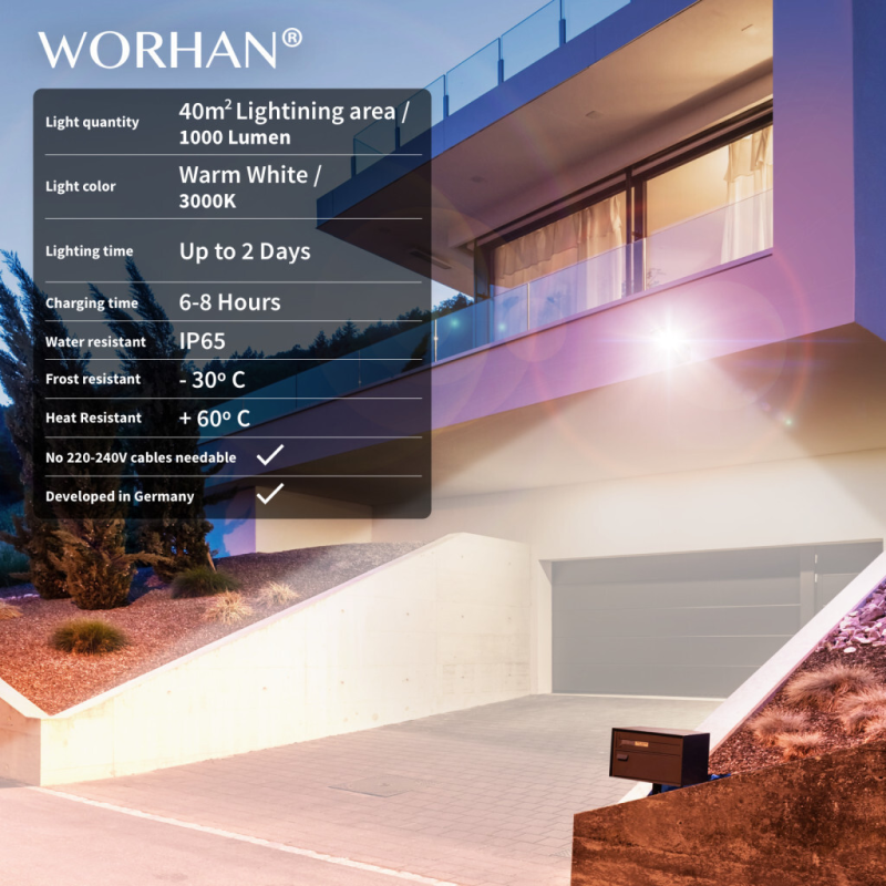 WORHAN® päikeseenergial töötavad valgustid lülituvad sisse, kui 10 meetri kauguselt avastatakse liikumist. IP65 niiskuse ja tolmu eest kaitsev klass tagab valgustite pika tööea.