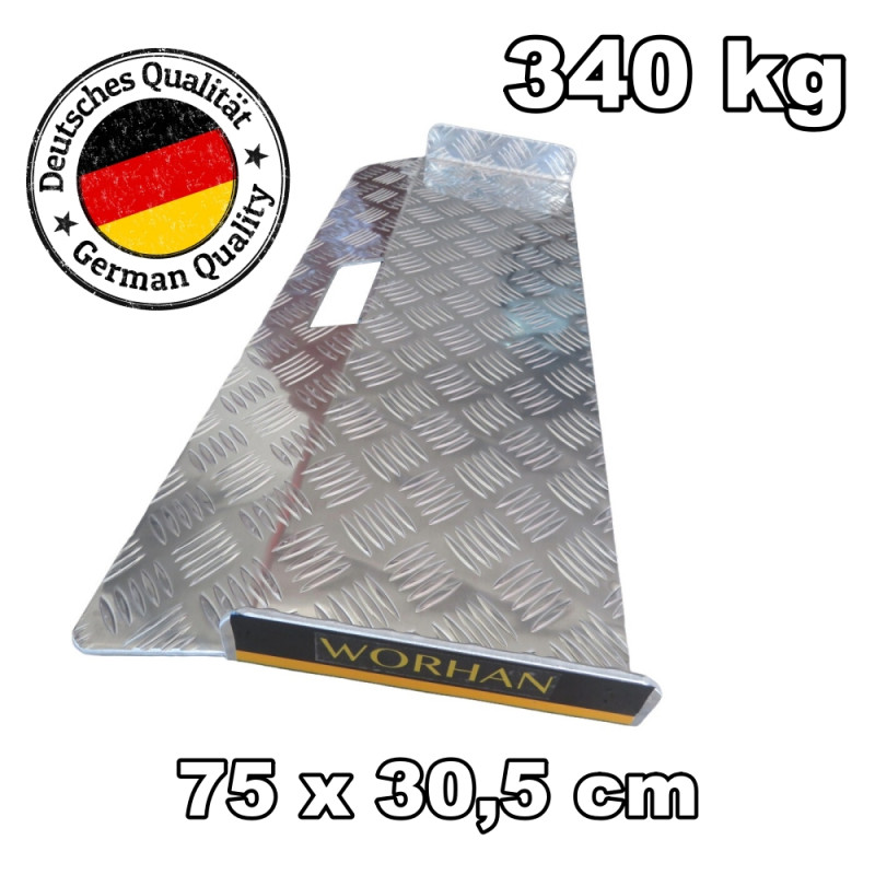 Ramp on valmistatud eriti vastupidavast anodeeritud alumiiniumist, mis talub roostet, korrosiooni ja keskkonnamõjusid. Pind on kaetud libisemisvastase mustriga, mis tagab suurepärase haarduvuse ka niisketes või vihmastes tingimustes.