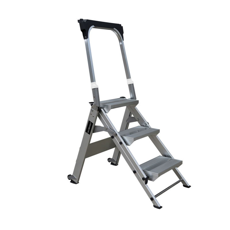 Kokkupandavad alumiiniumistredelid libisemiskindla pinnaga, käepideme ja rattastega, valmistatud kõrgekvaliteedilisest alumiiniumist. Redelite kandevõime on 175 kg.
