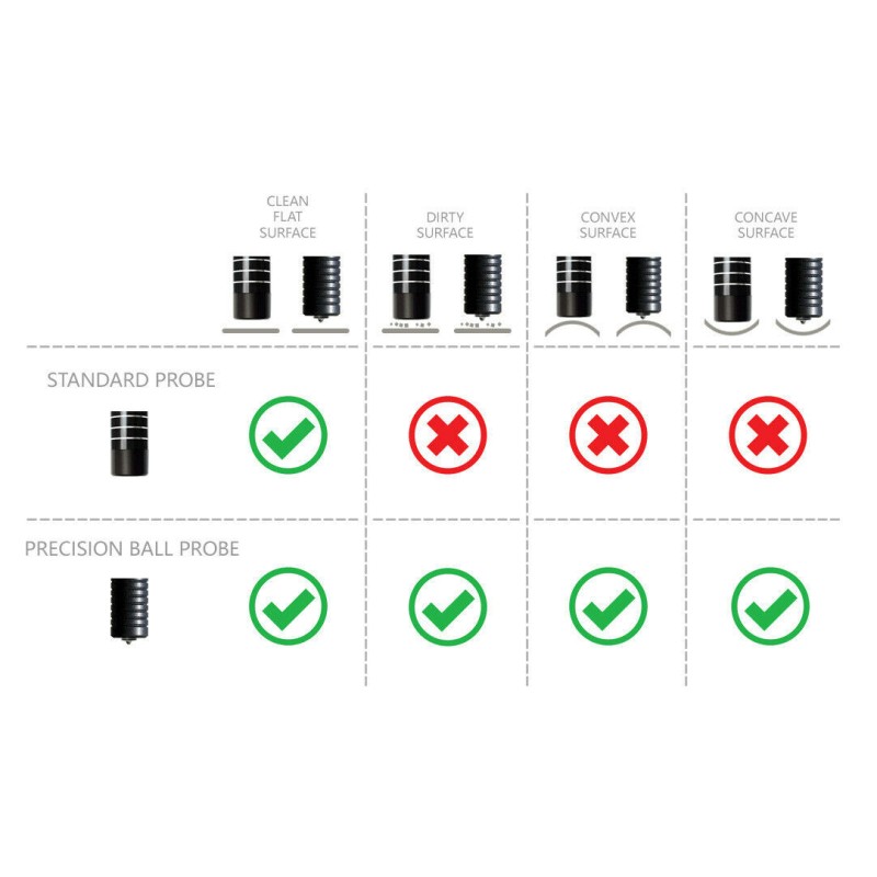 Üheteistkümnenda põlvkonna värvi paksuse mõõturid paistavad silma täpsusega ja mõõdavad värvi paksust alates 10 mikronist. 1 mikron võrdub 0,000001 meetriga. Täpsust teavet iga mudeli täpsuse kohta leiate toote spetsifikatsioonidest.